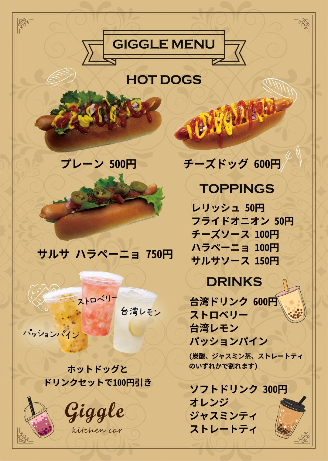 ホットドッグ専門キッチンカー「GIGGLE(ギグル)」では、こだわりのあらびきソーセージを使用したジューシーなホットドッグと、台湾ドリンクを提供しています。